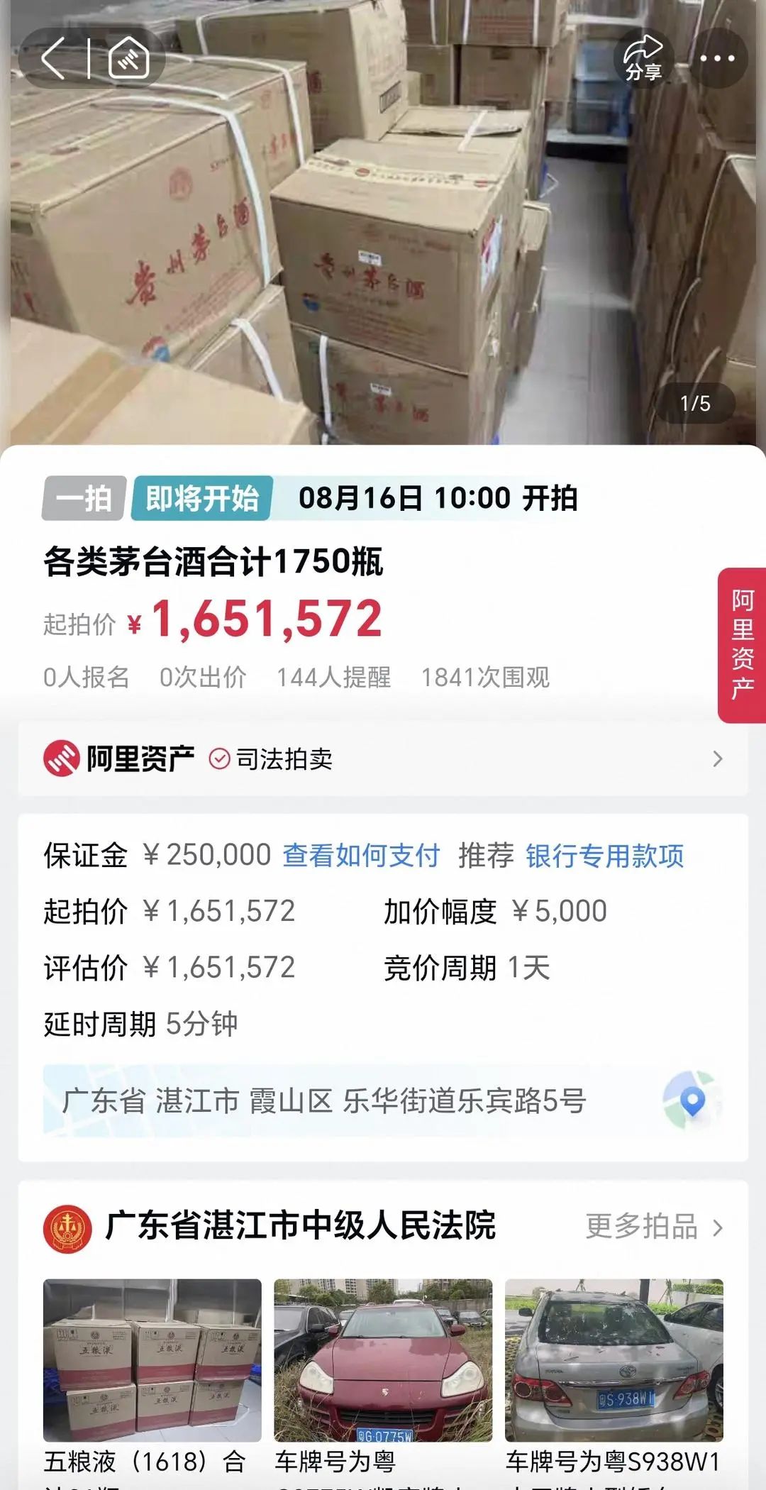 8月7日,红星新闻记者从阿里司法拍卖平台注意到,8月16日上午,广东省湛江市中级人民法院将在司法拍卖平台对1750瓶各类茅台酒进行拍卖,起拍价1651572元。